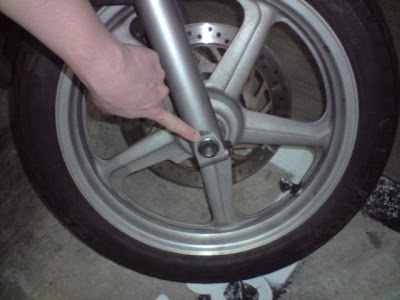 Now the axle is ready to come out. This is where you park the bike on a mainstand and use some sort of jack to support the front end. When I did this, I only had one jack, so I supported the front of the bike by jacking up on the exhaust headers. This will work in an emergency but I wouldn't recommend it. Get jackstands or get two jacks, and try to jack the bike up on the frame rails, or if your bike has them, the engine guards.